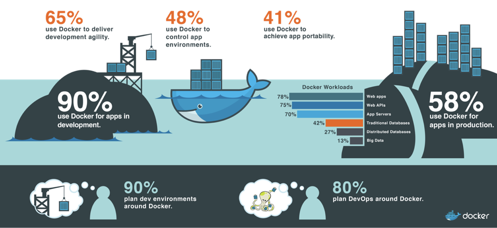 2016년 설문조사에서 90%가 개발에 사용중이고 80%가 DevOps에 사용할 예정이며 58%가 운영환경에서 사용중이라고 합니다. 2014년 도커 서울 밋업을 시작할 때만 해도 대부분의 사람들이 도커를 잘 모르고 개념도 이해하지 못했는데 이제는 거의 모르는 사람이 없을 정도로 널리 쓰이고 있습니다.