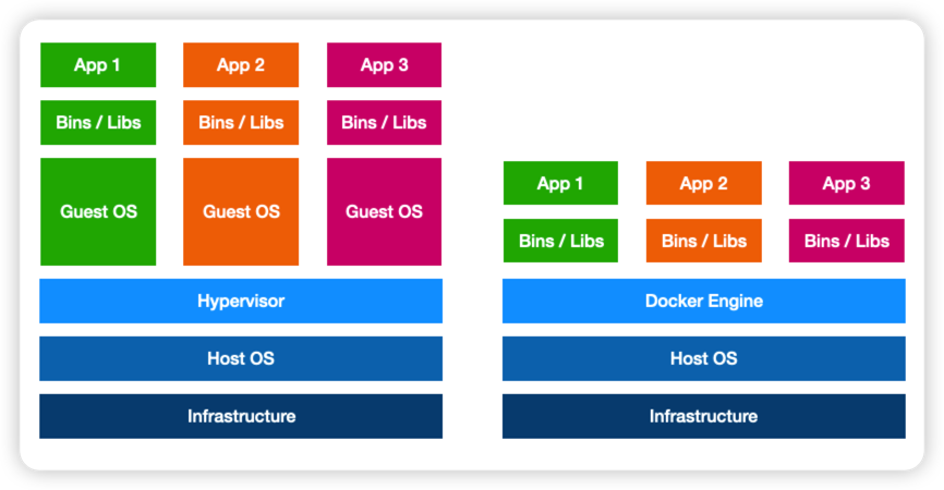 아래의 그림은 Docker와 Virtual Machine차이에 대해 찾아보면 가장 많이 보이는 그림이다.