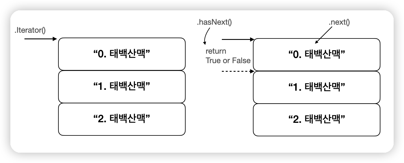 - Set, List 계열에 대입된 모든 것은 Iterable을 상속 받은 컬렉션을 상속 받고 있으므로 .itertor() 메소드를 사용하여 추출 가능