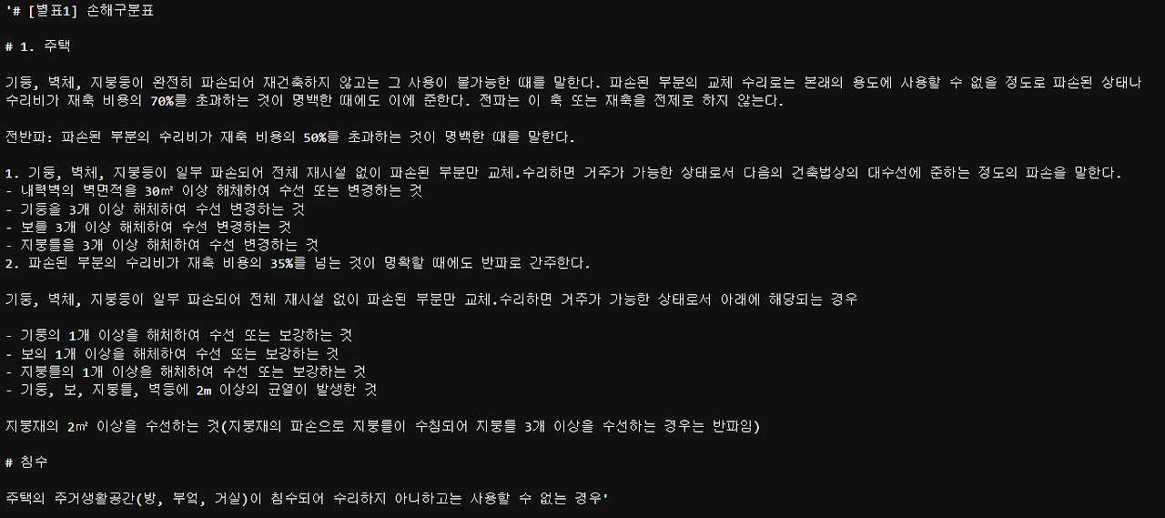 여기서 보시면 [별표1] 손해구분표, 1. 주택 앞에 #으로 헤더 표시를 통해 강조가 된 것을 확인할 수 있습니다.