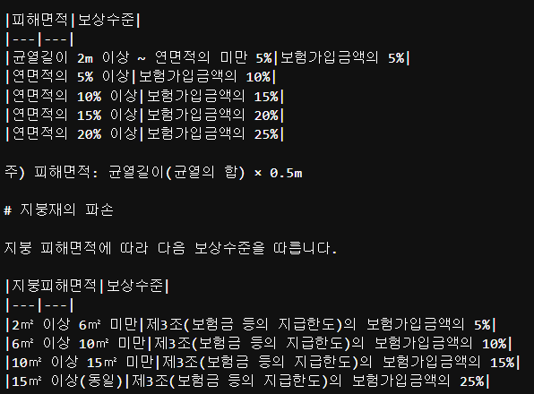 하지만, 파손 / 지붕재 / 전파, 유실 등 일부 텍스트가 사라진 것을 확인할 수 있으며, Markdown에서 표의 형식으로 반환하지도 못한 것을 확인할 수 있습니다. 이는 예시로 사용한 표는 컬럼의 헤더가 존재하지 않아서 그런 것 같습니다.