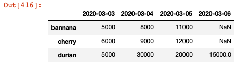 durian이라는 데이터를 넣었습니다. Series의 name값이 Dataframe의 index로 사용되는데 이번에는 3개가 아닌 4개의 데이터를 넣어봤습니다. 다른 개발 언어라면 에러가발생하고 막 그랬을텐데, 파이썬의 장점이자 단점?으로 다른 값은 NaN으로 처리가되고 에러는 발생하지 않습니다. 이렇게 데이터까지 하나 더 추가해보니까 확실히 Series와 Dataframe의 구조가 이해되는 것 같습니다.